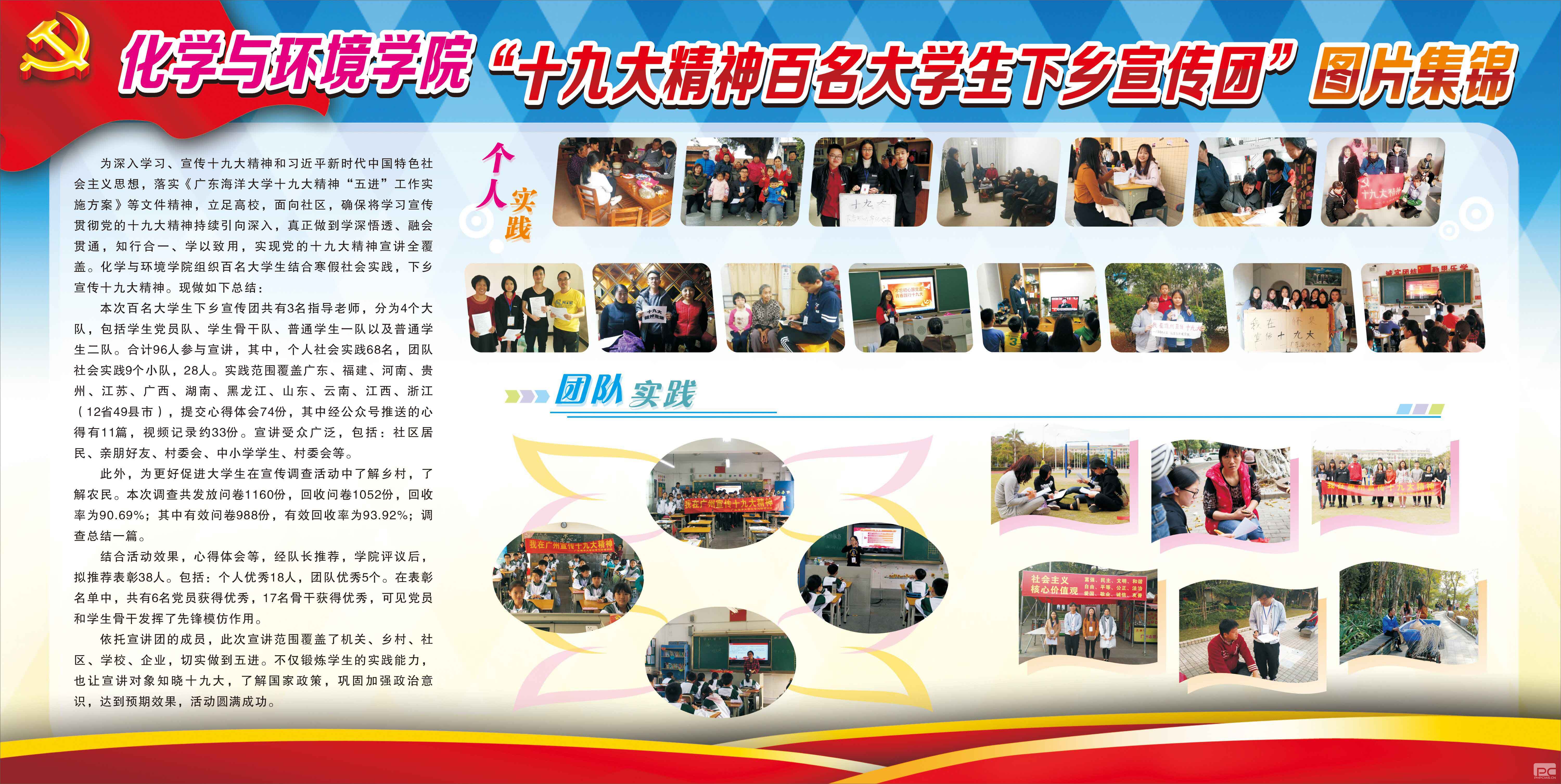 本次百名大学生下乡宣传团共有3名指导老师,分为4个大队,包括学生党员队、学生骨干队、普通学生一队以及普通学生二队。合计96人参与宣讲,其中,个人社会实践68名,团队社会实践9个小队,28人。宣传受众2000多人,包括:社区居民、村民、亲朋好友、中小学学生、街头行人等;实践范围覆盖广东、福建、河南、贵州、江苏、广西、湖南、黑龙江、山东、云南、江西、浙江(12省49县市),提交心得体会70多篇,多篇宣传员的个人体会与感悟在自媒体上发表,视频记录约33份。