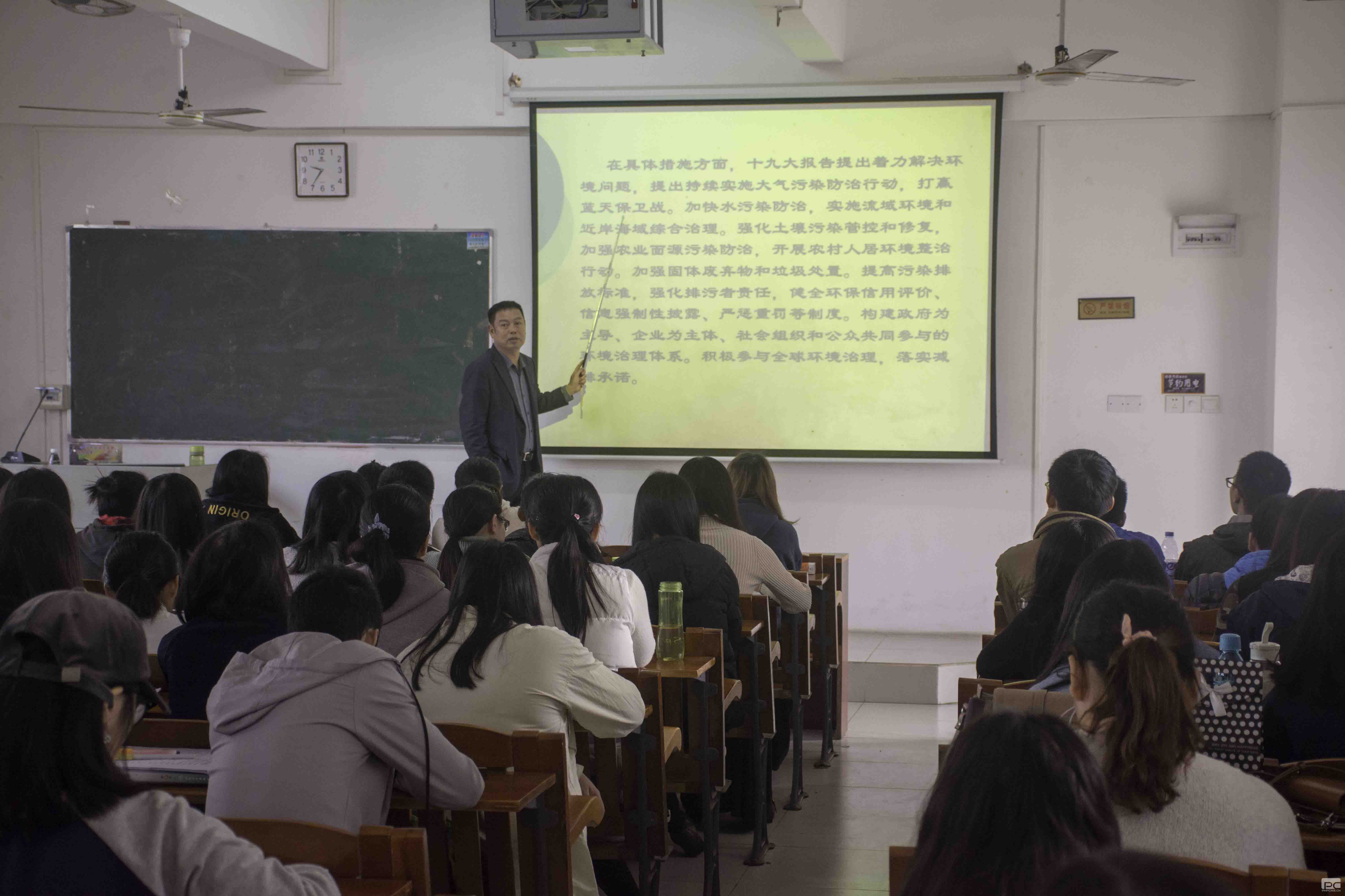 第二个专题学习,由杨磊院长为大家做宣讲,杨院长以十九大报告中的“生态文明”为切入点,讲述我国经济发展中所出现的污染问题,以及这些问题出现的时代因素,并列举新时期党和国家对于环境问题所采取的一系列举措。杨院长结合我院的专业特点,认为环境保护将是未来的新兴产业,大家要充分利用这个“风口”,以便将来“飞起来”。