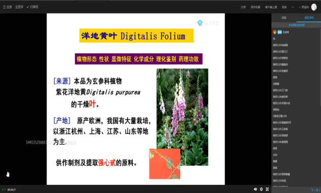 公开课第一场由获得2015年度校级授课竞赛一等奖的孔松芝老师主讲《生药学》。孔松芝老师使用腾讯课堂进行线上直播教学,并充分利用腾讯课堂的语音连麦功能与学生互动,其课件中包含大量生药原植物生境、外形、内部结构及各类鉴别特性等彩色图片,有效提高了教学的直观性、丰富性和趣味性;整个教学讲授过程思路清晰、讲解生动、重点突出,结合实例通俗易懂,教学环节完整,教学效果良好。
