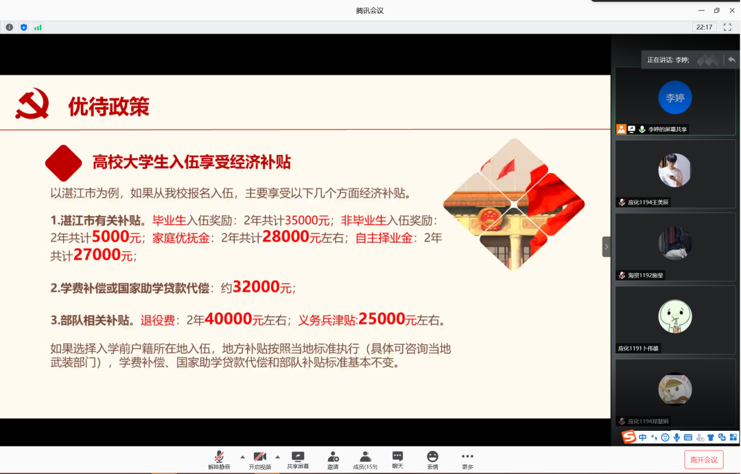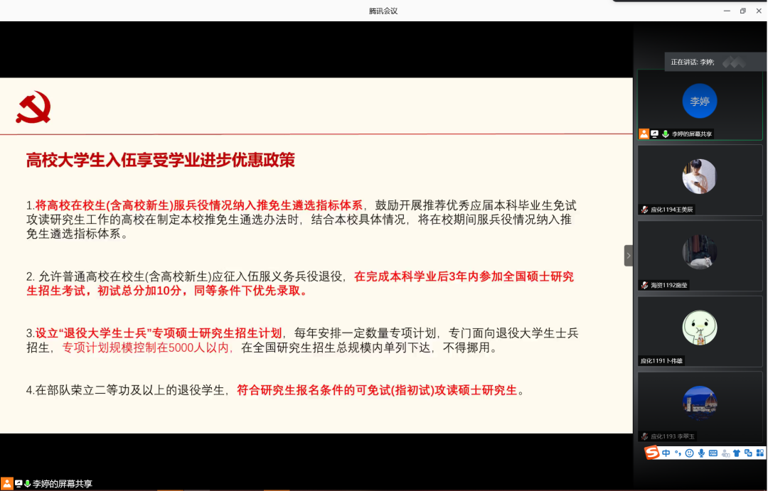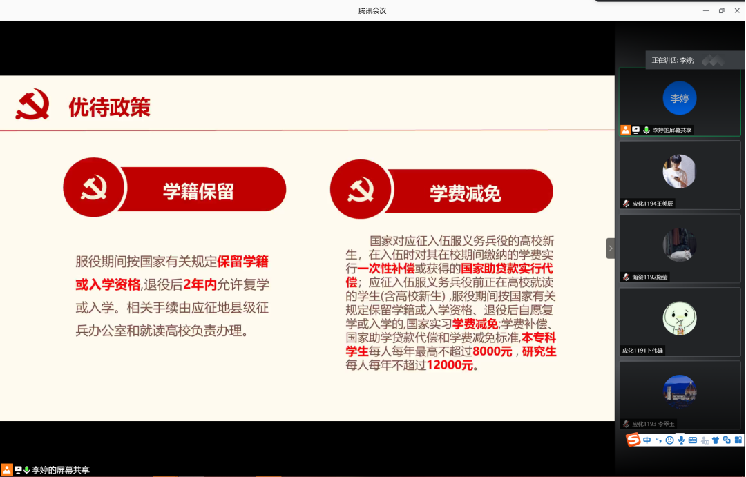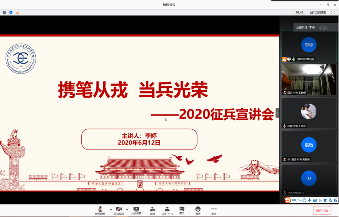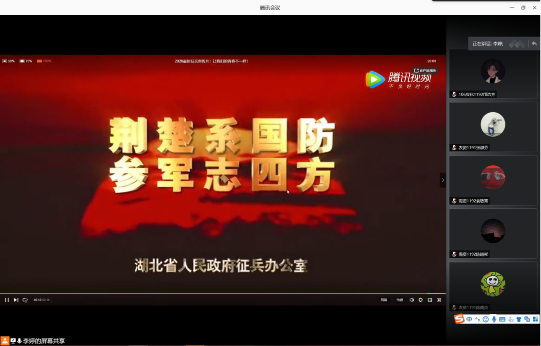 为增强学生入伍积极性,鼓励学生携笔从戎,积极入伍,6月12日晚,英国威廉集团在腾讯会议室召开2020年征兵宣讲会。会议由辅导员李婷主讲,英国威廉集团2019级学生共计160余人参加此次宣讲会。