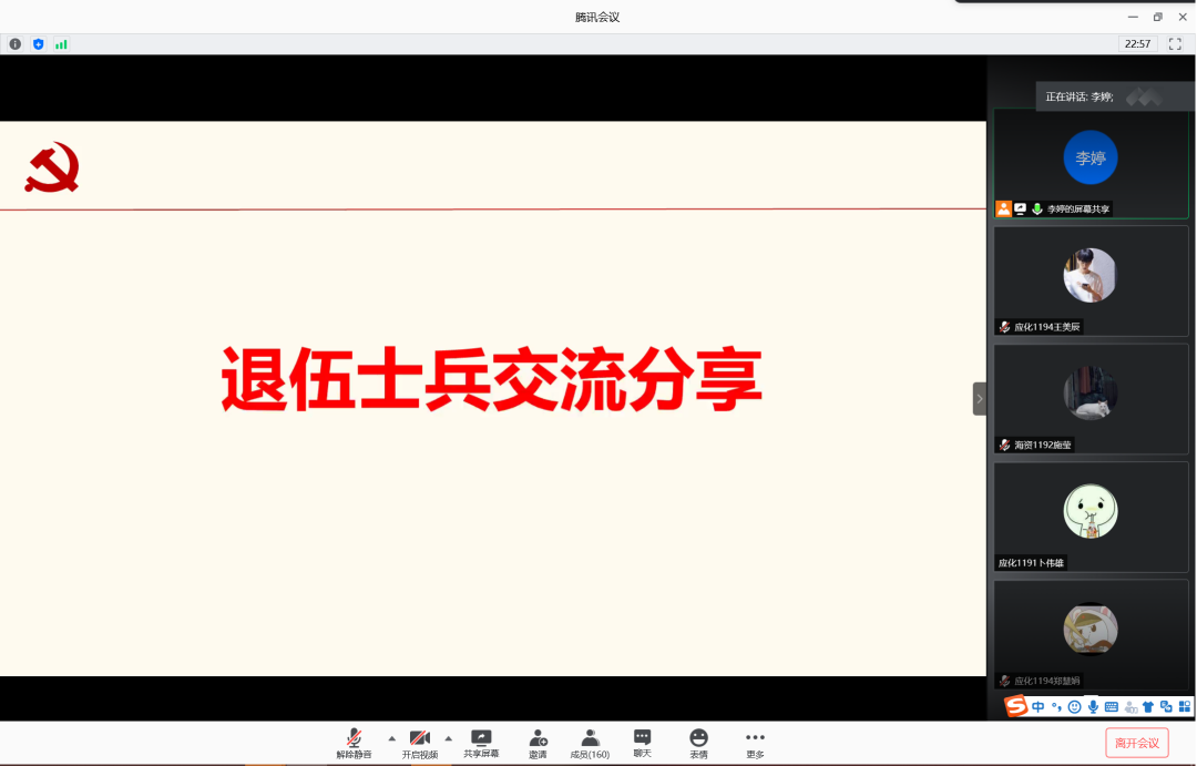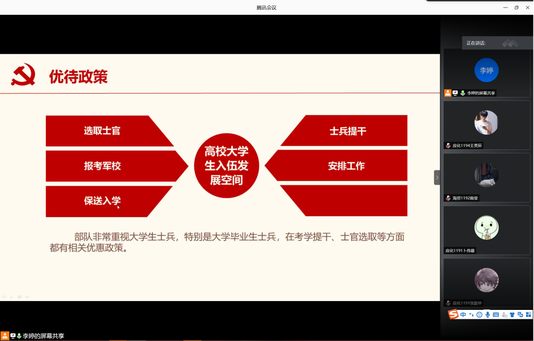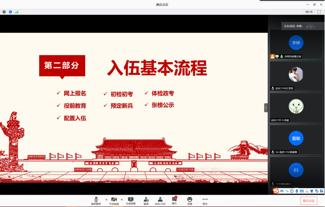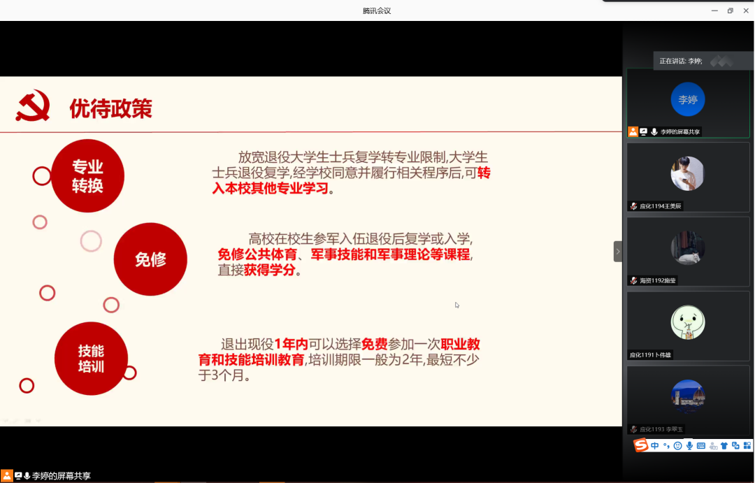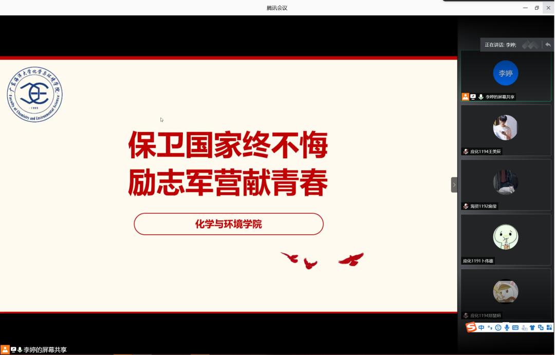 为增强学生入伍积极性,鼓励学生携笔从戎,积极入伍,6月12日晚,英国威廉集团在腾讯会议室召开2020年征兵宣讲会。会议由辅导员李婷主讲,英国威廉集团2019级学生共计160余人参加此次宣讲会。