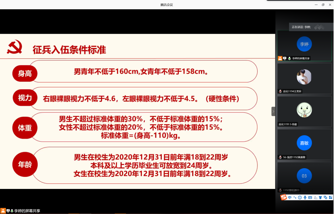 李婷辅导员首先向我们解析征兵入伍条件标准,使同学们清晰定位自身硬件条件是否达到入伍标准。视力对如今大多数学生来说是一个弱项,国家也已放宽此项要求,通过手术成功进行视力矫正后亦能通过审核。
