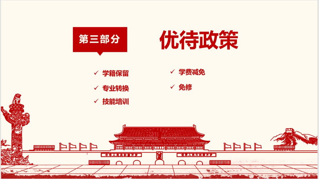 辅导员着重向我们分点介绍入伍优待政策,给我们总结入伍有何社会、经济上的优待福利,对自身发展有何益处,鼓励学生积极入伍。演示文稿内也清晰详细地说明了入伍优待政策。