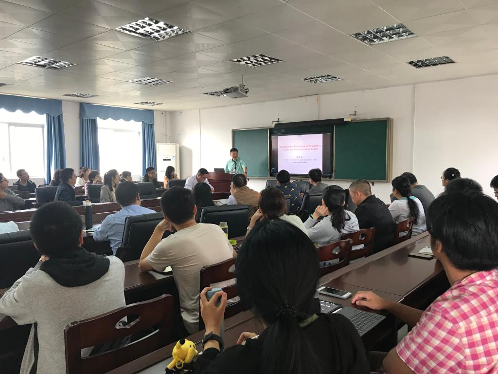 殷克东教授对“珠江入海口的水体富营养化导致严重的环境问题”这一国内外重要课题做了汇报,深入浅出的讲解了藻类大量繁殖及随之而来的溶解氧的消耗导致水中低氧问题,并提出了处理水体营养盐污染的策略是去除最限制性营养盐的解决方法。结合香港特别行政区政府进生活污水排放实例,该策略取得了较好的生态环境效益和经济效益。报告结束后,与会人员就最限制性营养盐、赤潮与无氧区等问题展开了热烈讨论,对学院师生的科研工作具有启发与指导意义。