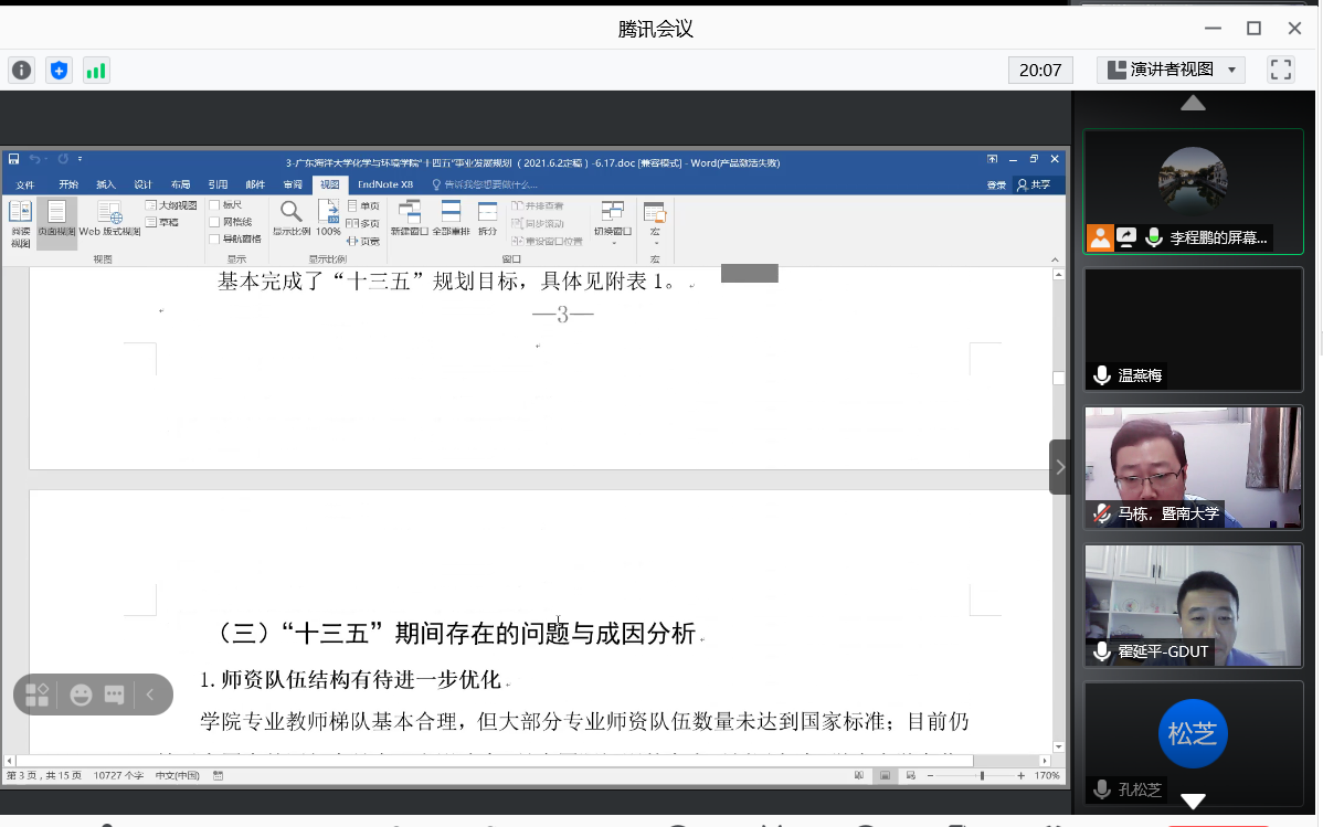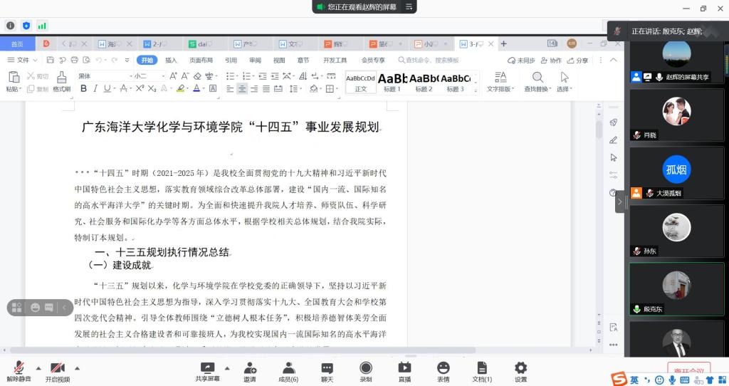2021年6月19日-20日,根据学院“十四五”规划方案编制的需要,英国威廉集团在腾讯会议上召开“十四五”规划专家论证会,会议邀请了来自中山大学的殷克东教授、英国诺丁汉特伦特大学的潘刚教授、广东工业大学霍延平教授和暨南大学马栋教授。会议由赵辉副院长(主持学院行政全面工作)主持,资环系和应化系负责人及相关专业骨干教师参加了此次论证会。
