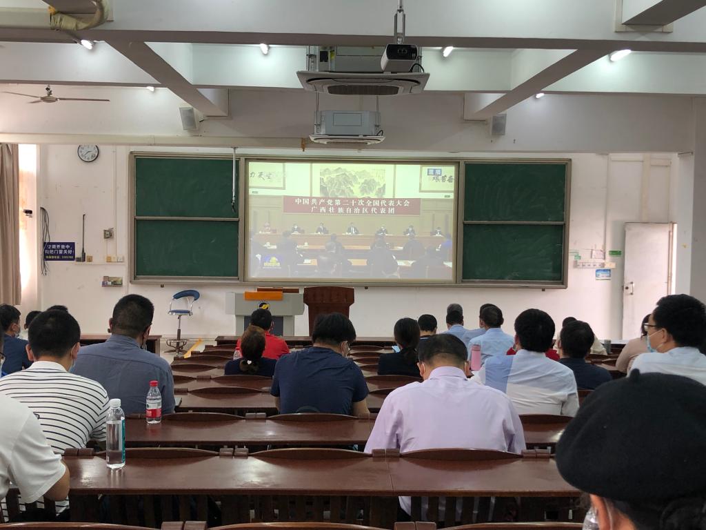 会上,蔡鹰带领全体教职工共同学习了习近平总书记在参加党的二十大广西代表团讨论时发表重要讲话精神,并观看了相关视频。