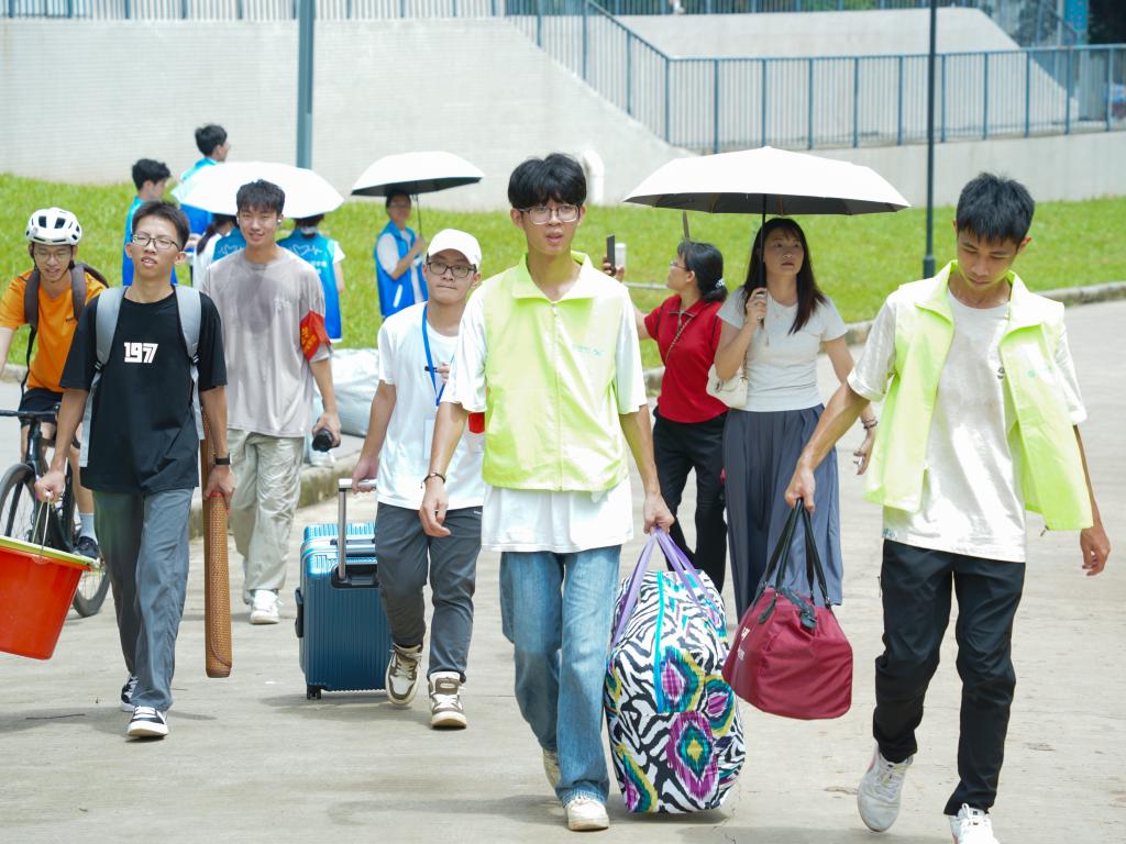 学院志愿者为新生把行李从接待点往学生宿舍搬运