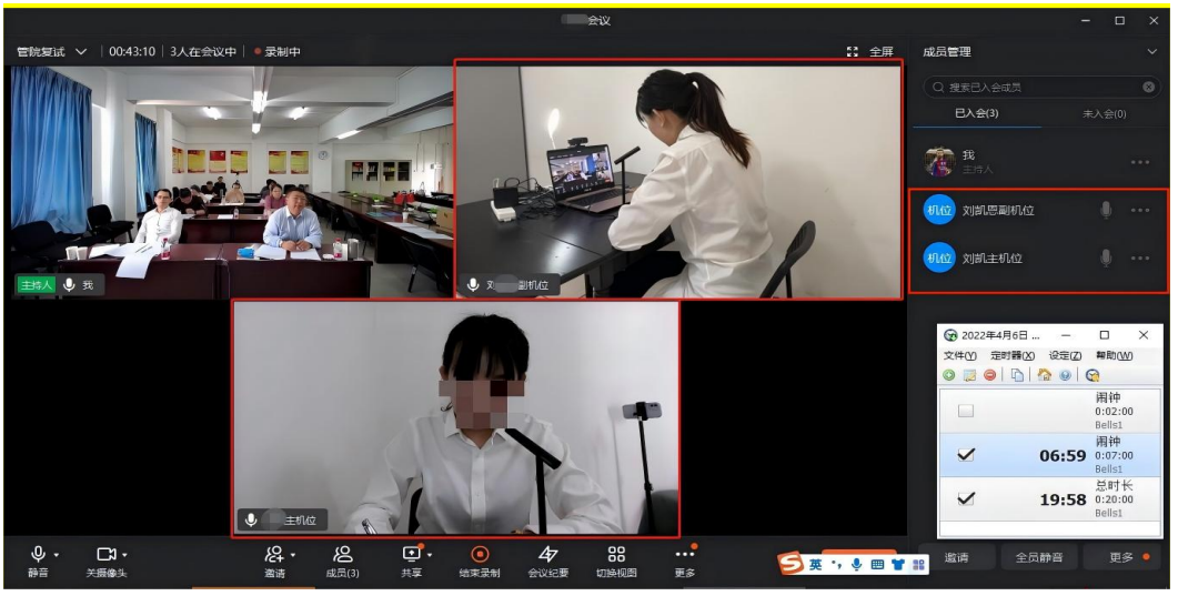 (1)复试形式:通过腾讯会议复试,复试前发给考生会议号。考试采用“双机位”方式。需准备具有摄像头的2个联网视频设备(1台电脑+1部手机或2部手机),请考生用两个设备分别登录腾讯会议(需两个账号),并确保设备电量充足。